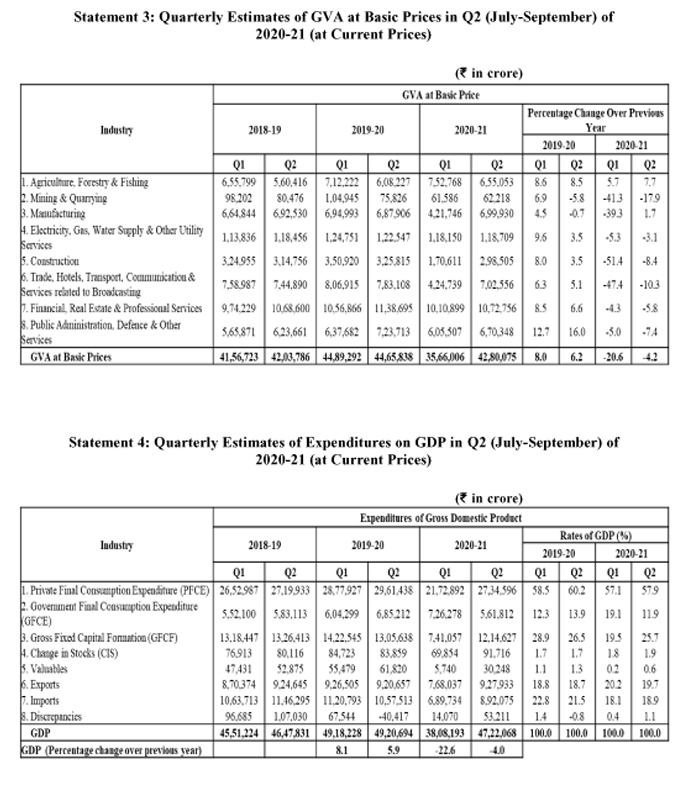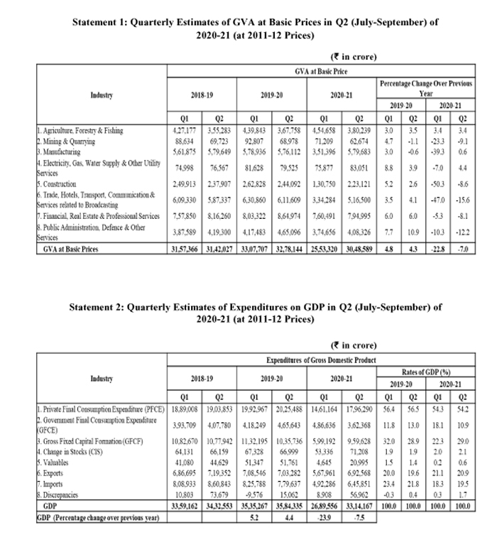 जीडीपी वित्तवर्ष 2019-20 के दुसरे तिमाही के ₹ 35.84 लाख करोड़ की तुलना में वित्तवर्ष 2020-21 के दुसरे तिमाही में ₹ 33.14 लाख करोड़ रहा|