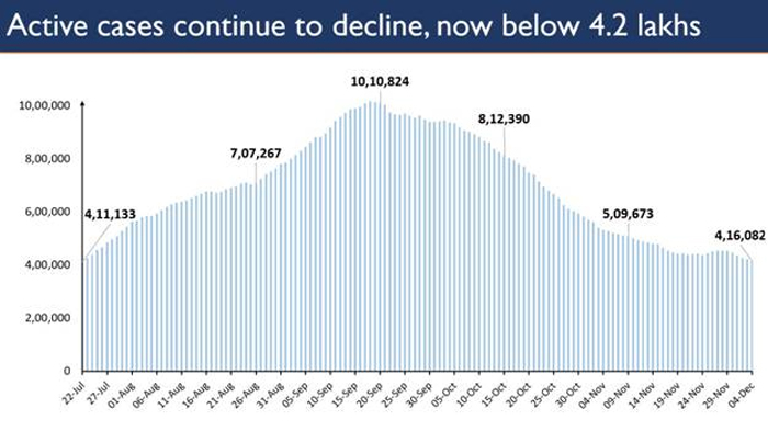 देश में कोरोना के सक्रिय मरीजों की संख्या में गिरावट जारी है| सक्रिय मरीजों की संख्या कुल मरीजों के कल के 4.44% से गिरकर आज 4.35% हो गया है।